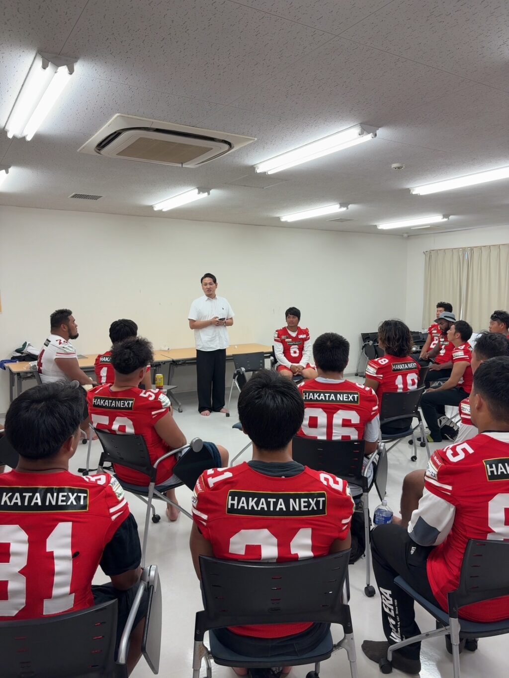当日は、選手・スタッフを前にご挨拶を賜り、株式会社ハカタネクストを創業されてからの歩みや企業としての理念、そして今回のスポンサーシップに込められた想いについて熱くお話しいただきました。さらに「SUNSと共に歩むのではなく、歩み続けるために。これからはチームの経営や運営の側面も含め、共に挑戦していきたい」と力強いメッセージを頂戴いたしました。